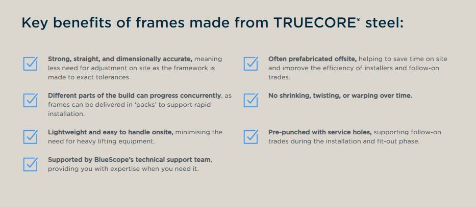 We use TRUECORE® STEEL supplied by BLUESCOPE® for all our frames, trusses and flooring systems which can be delivered to your site as prefabricated, engineered, screwed wall frames / trusses or as a flatpack for your own assembly. Our projects span across Victoria and regional NSW, covering both residential and commercial sectors, including homes, retirement villages, childcare centres, and more. We take pride in being an exclusive supplier of BLUESCOPE® steel frames using their ENDUROFRAME® building system and roll form machines.